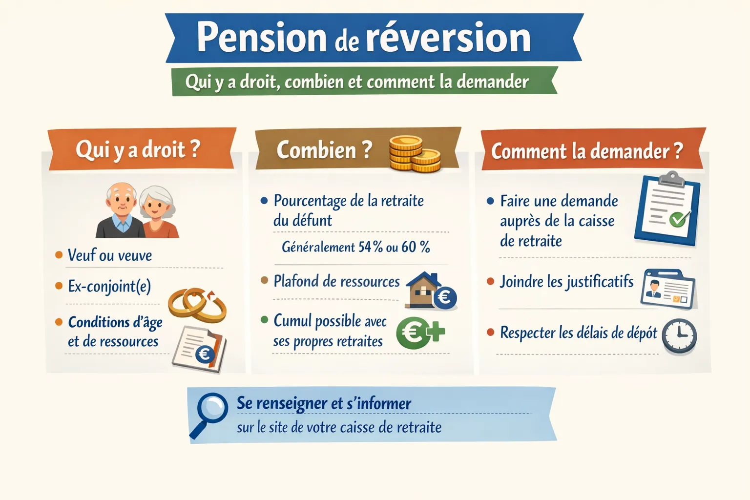 Le point commun, lui, est net : la réversion n’est pas une “aide” automatique, c’est un droit dérivé de la retraite du défunt, à demander, avec des conditions précises et des effets parfois très différents selon votre situation de couple.